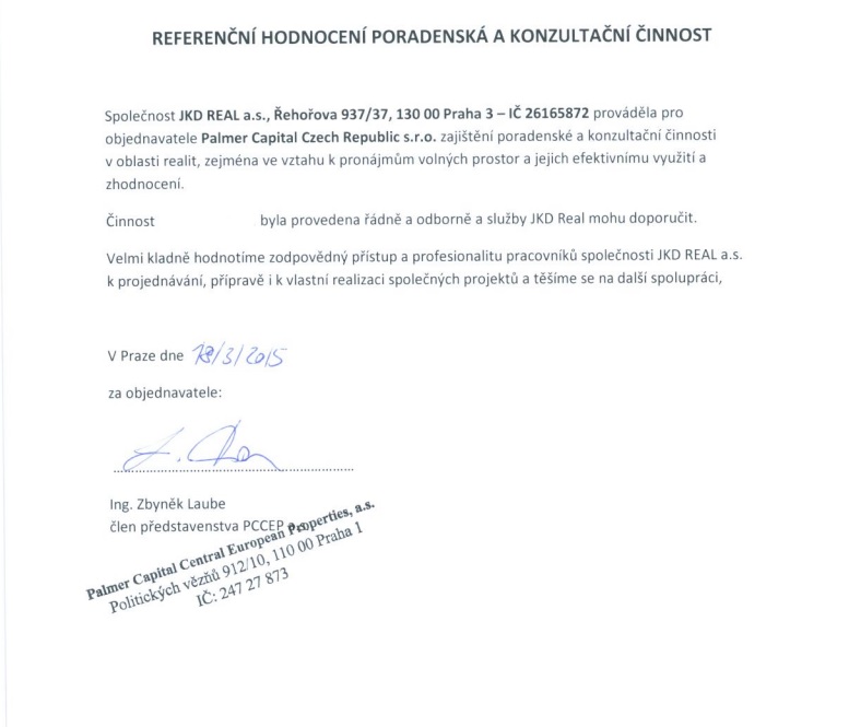 JKD REAL, a.s. zajišťovala pro společnost Palmer Capital Czech Republic s.r.o. poradenskou a konzultační činnost v oblasti realit.